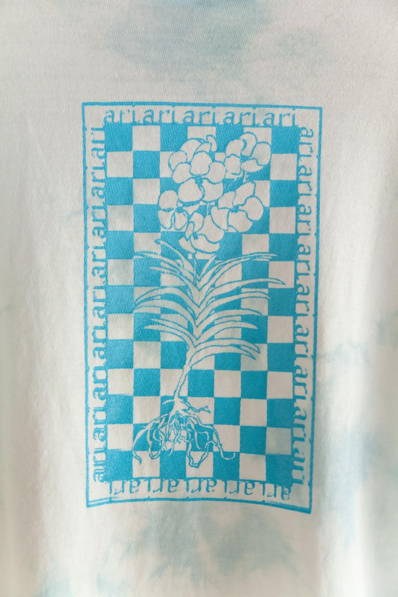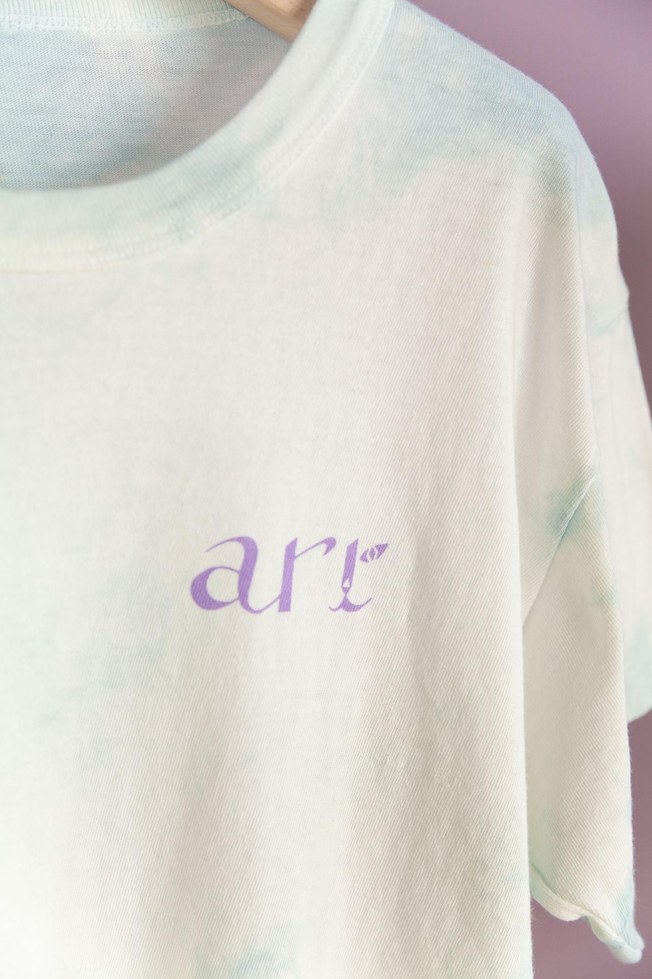 ほんのり生成りがかったホワイトのTシャツボディにタイダイ。
