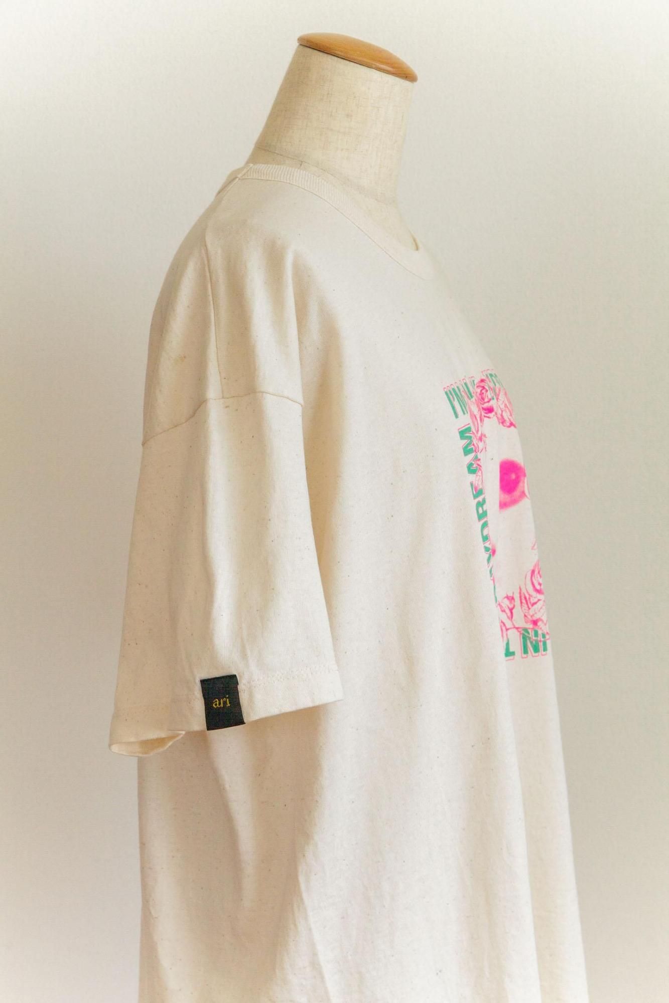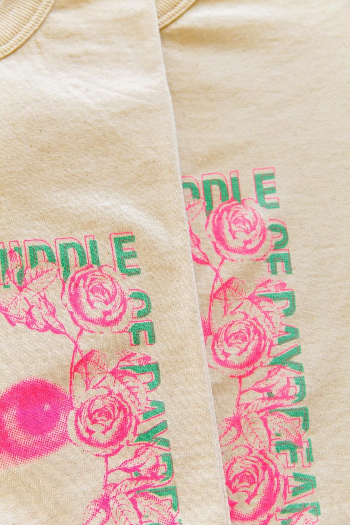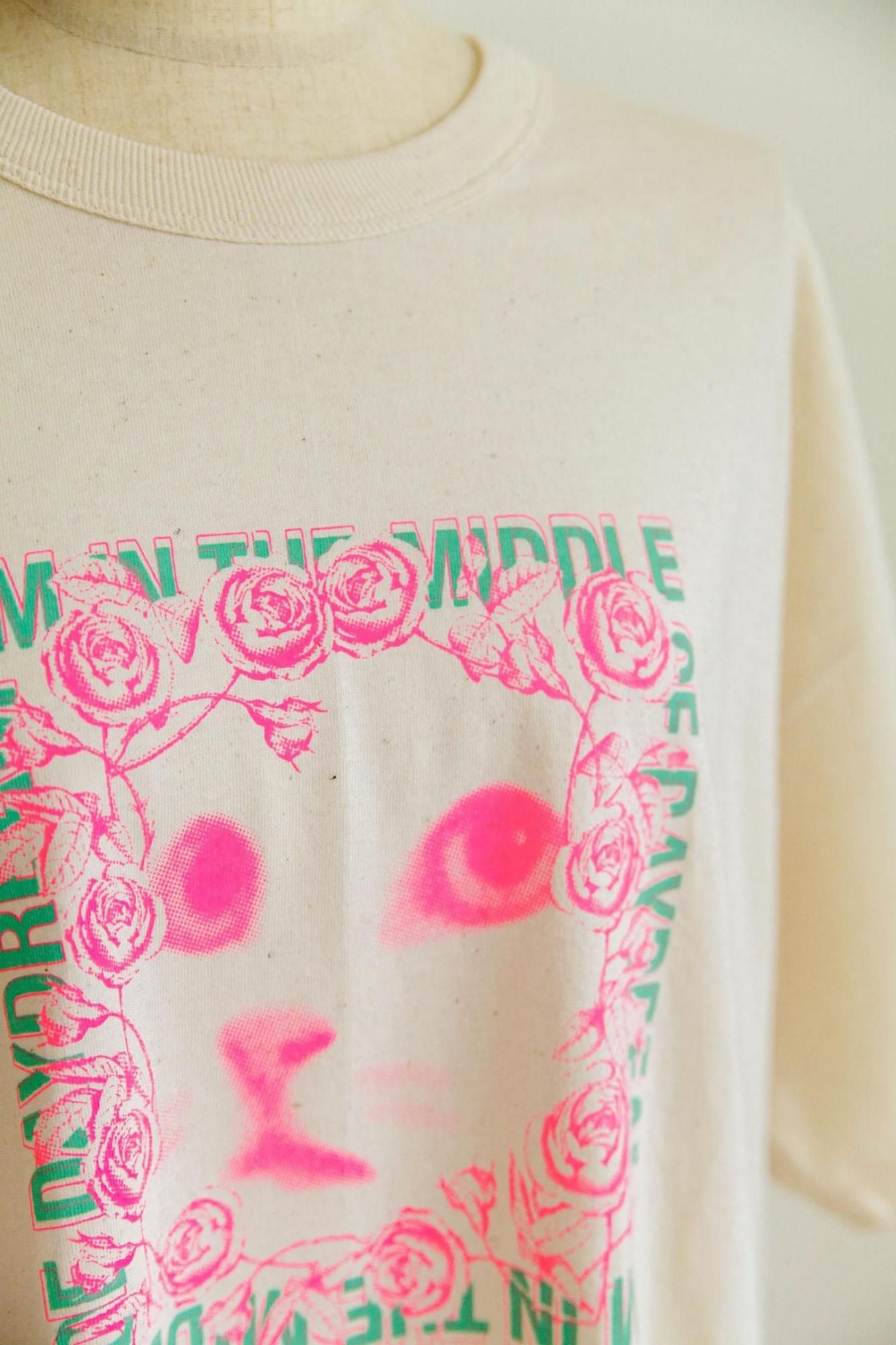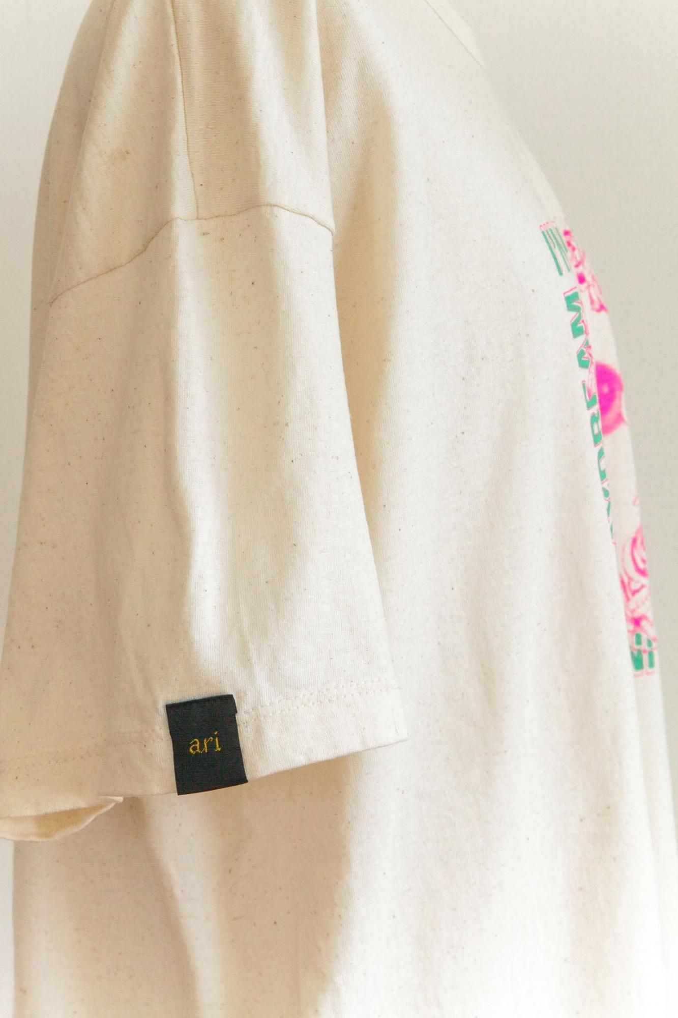 今回はTシャツのボディカラーは生成りで統一。プリントのカラーは、ポップな印象のネオンピンク×ミントグリーンと、クラシックな印象のブラック × インクブルーの2パターンをご用意。それぞれ、全く印象の異なる仕上がりです。