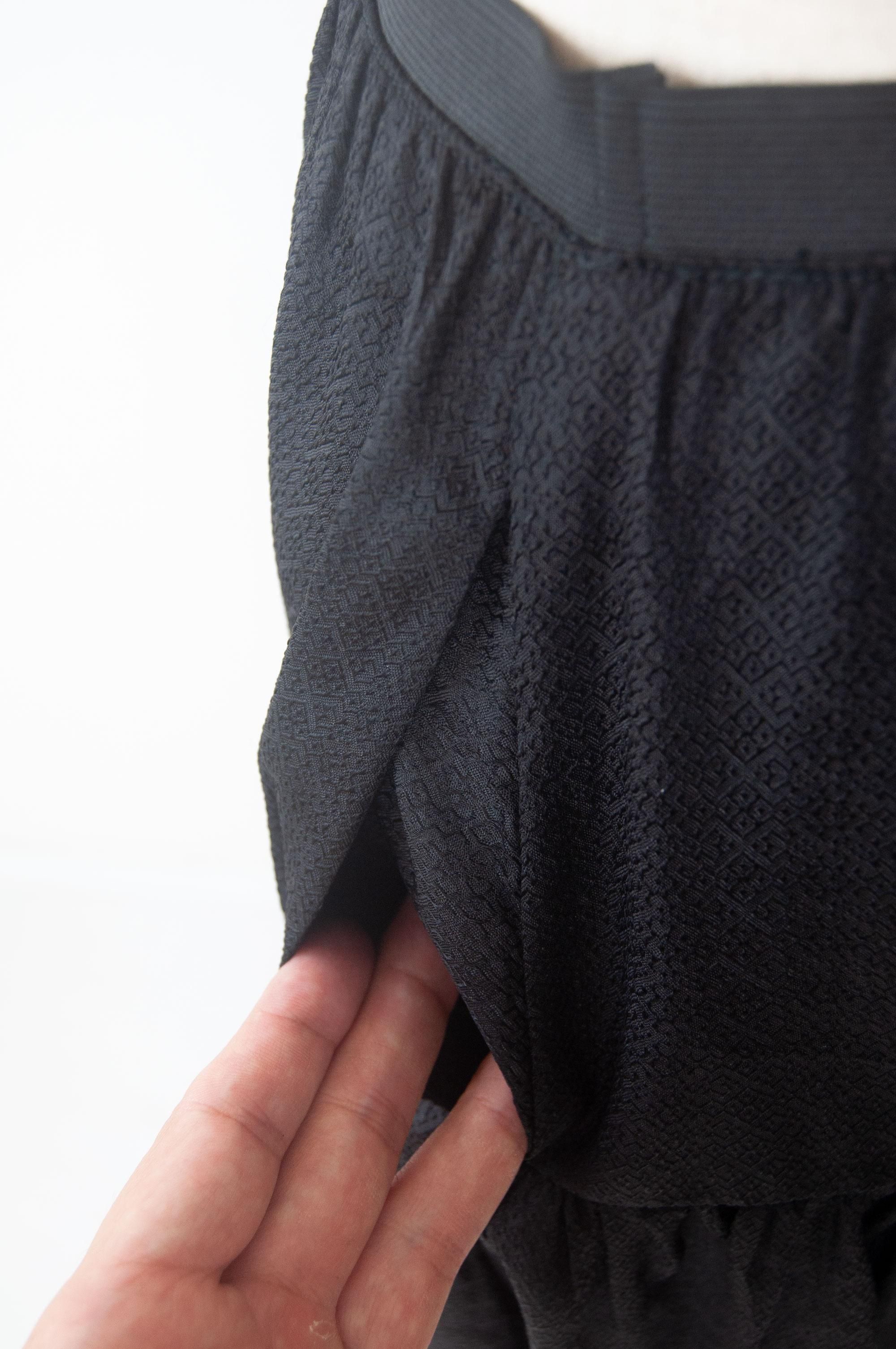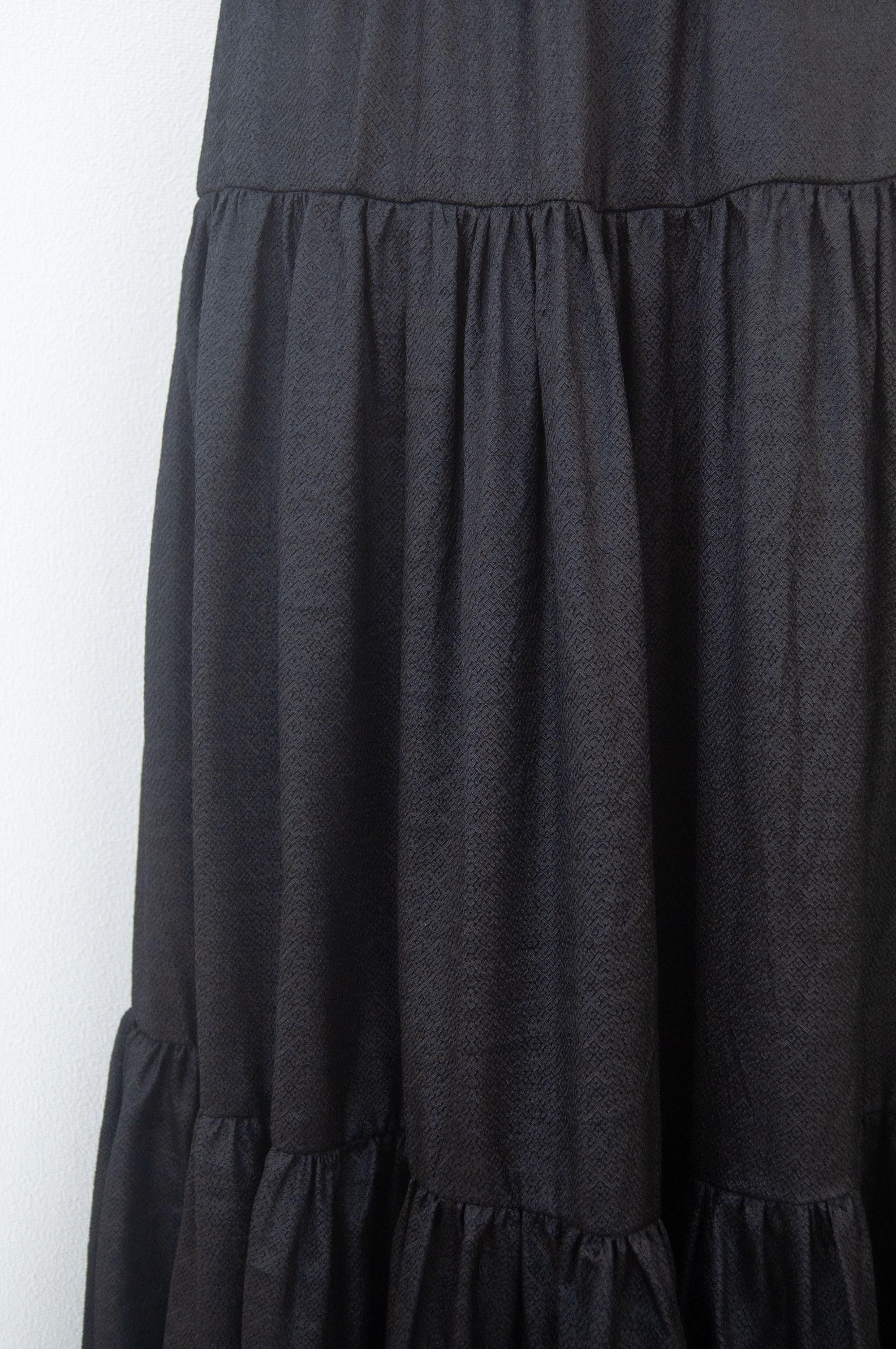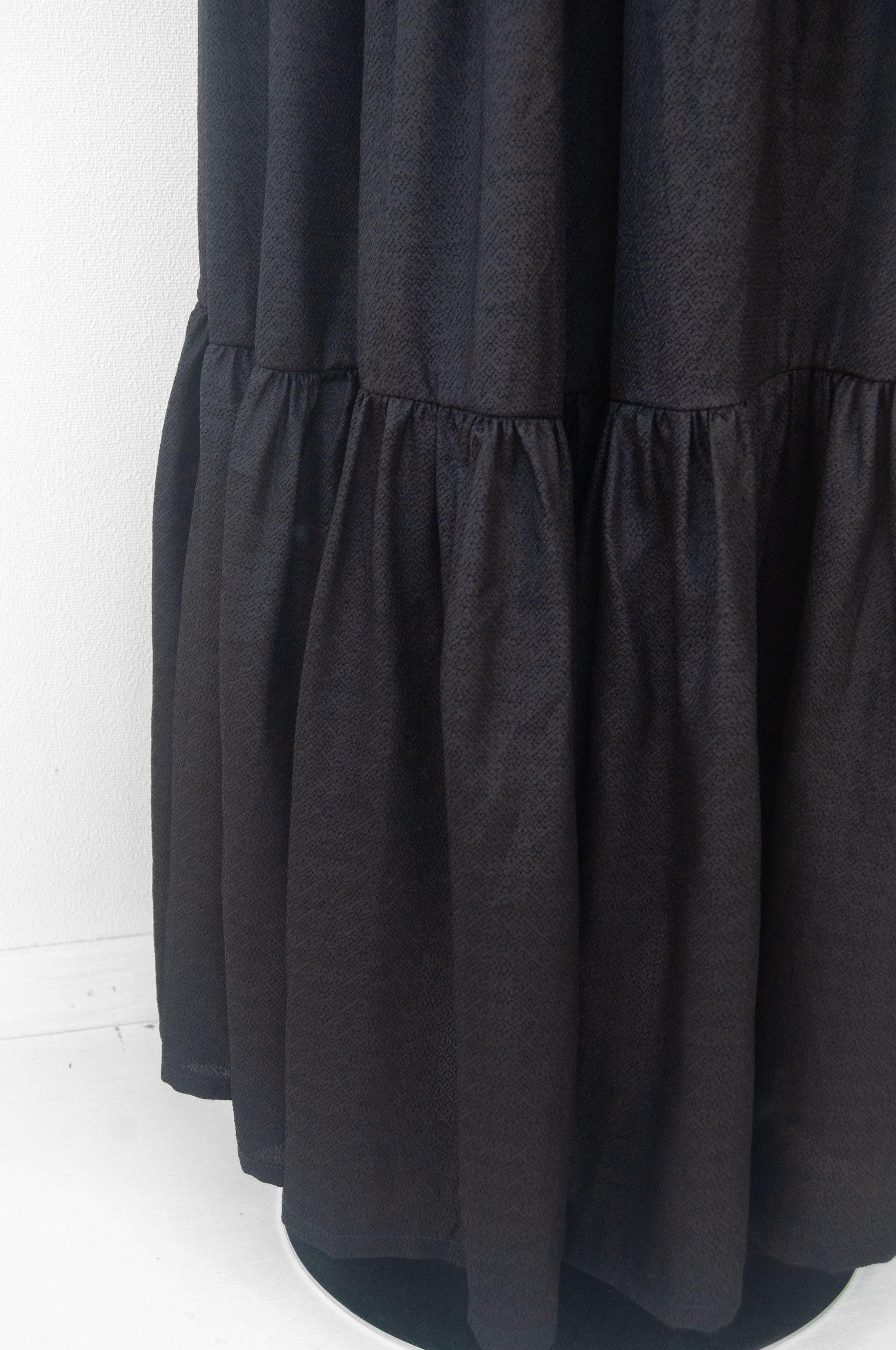 裾の方にはたくさんの生地を使いふんわりと、ウエスト周りはすっきりと見えるようなデザイン。