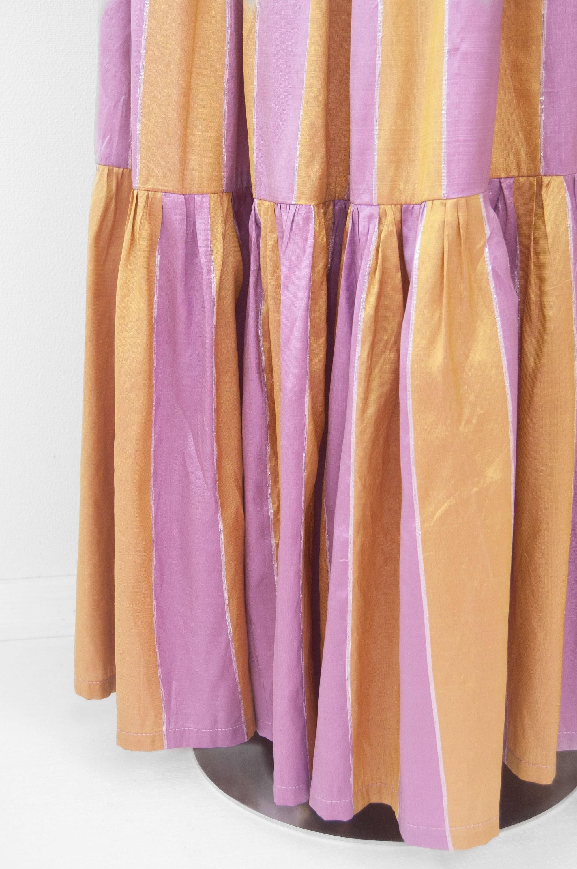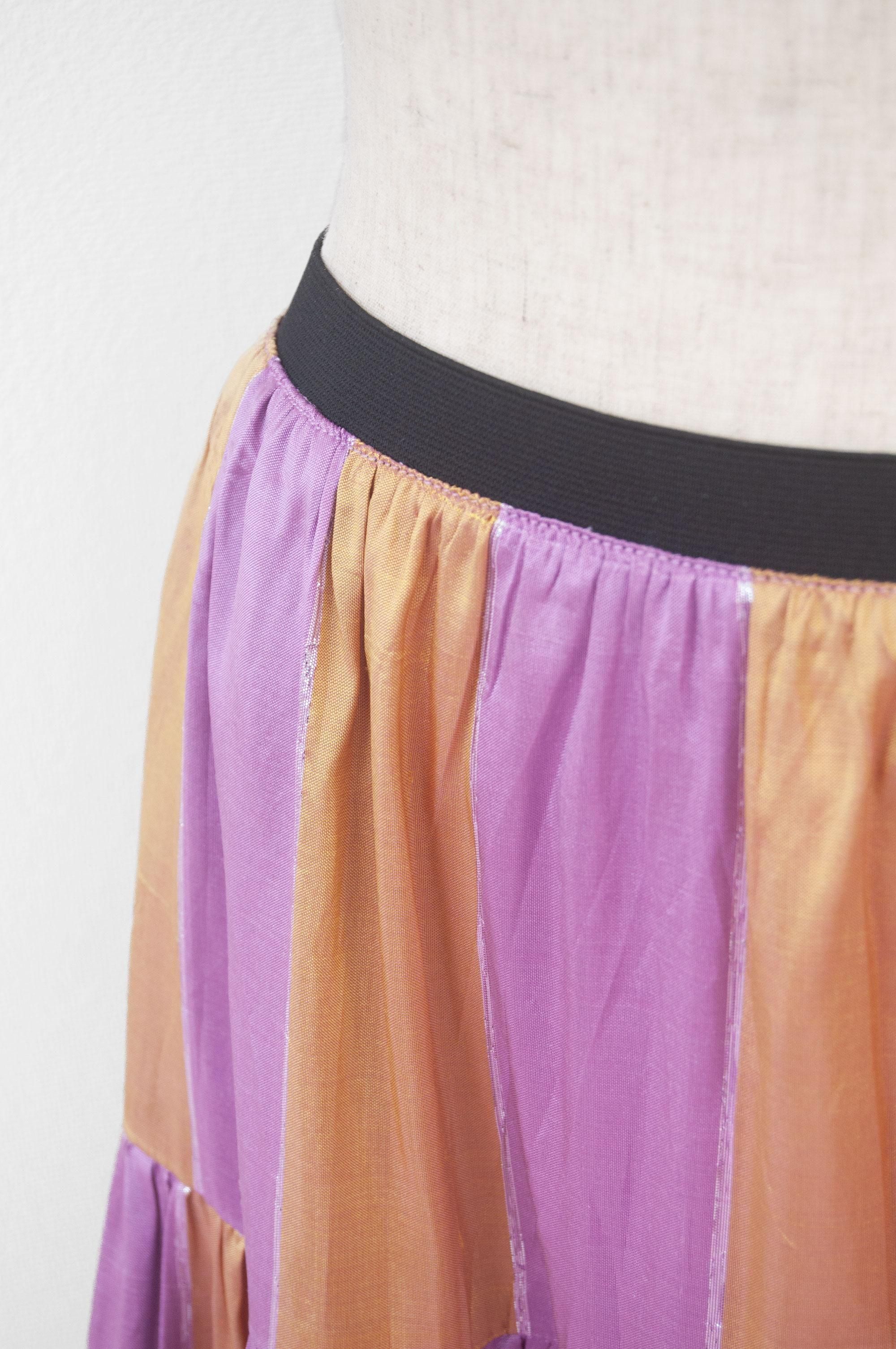 裾の方にはたくさんの生地を使いふんわりと、ウエスト周りはすっきりと見えるようなデザイン。